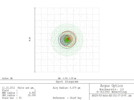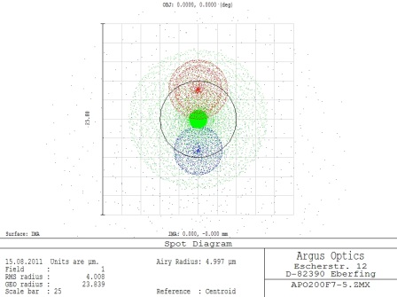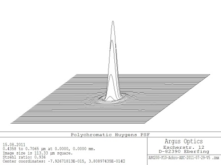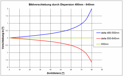 The graph on the right shows that this effect depends on the height above horizon or the distance to the zenith. Depending on the distance to the zenith the spread between blue and red starlight grows and exceed for zenith distances above 55° (35° above horizon) the diameter 1arcsec corresponding to the resolution of a 4” refractor.
